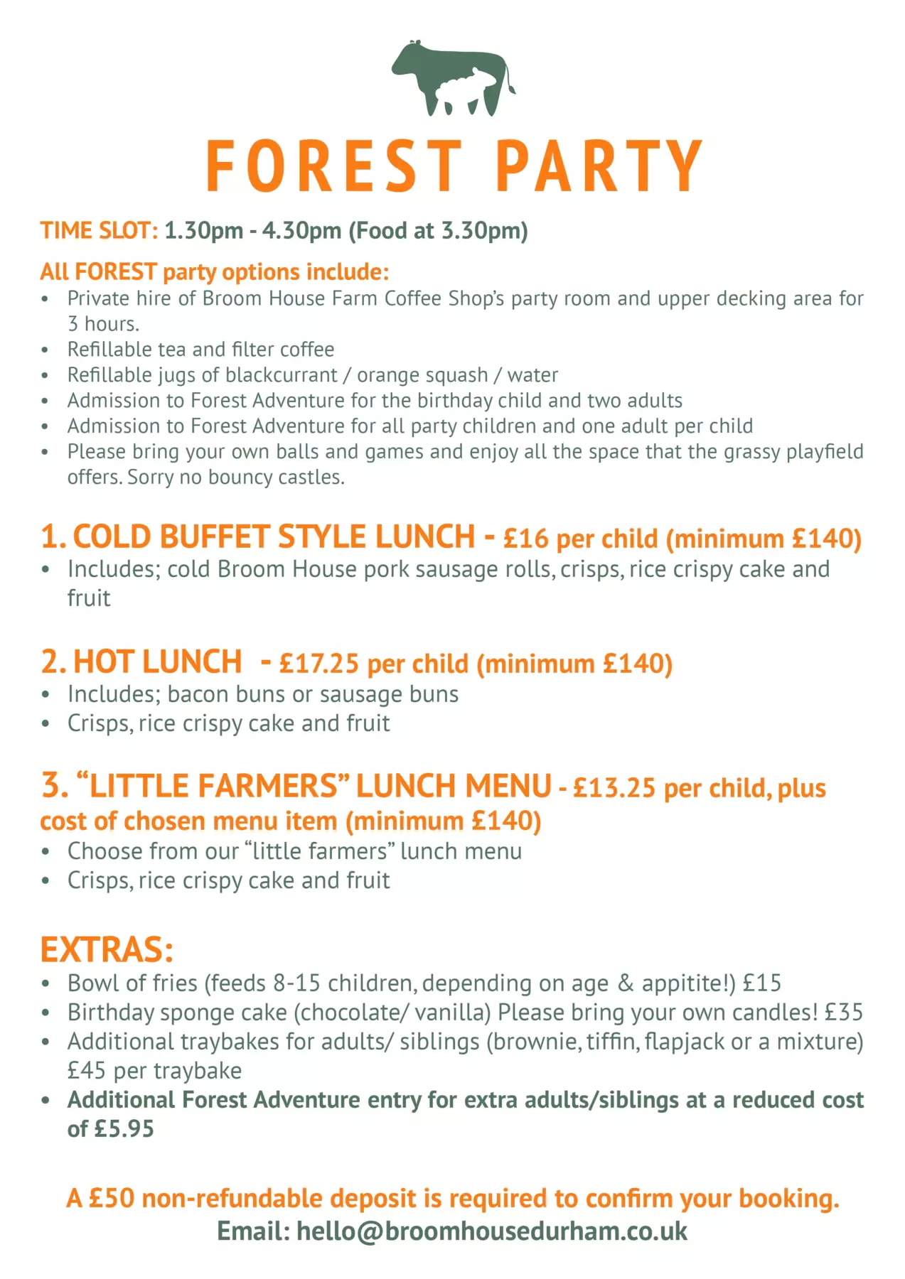 Broom House Farm is a wonderful venue for children’s parties. We recommend spending an hour or so in the Forest Adventure and then bring your group back for a tasty meal, but we can tailor your children’s parties to fit with your ideas. Please visit us before you book to check our facilities.