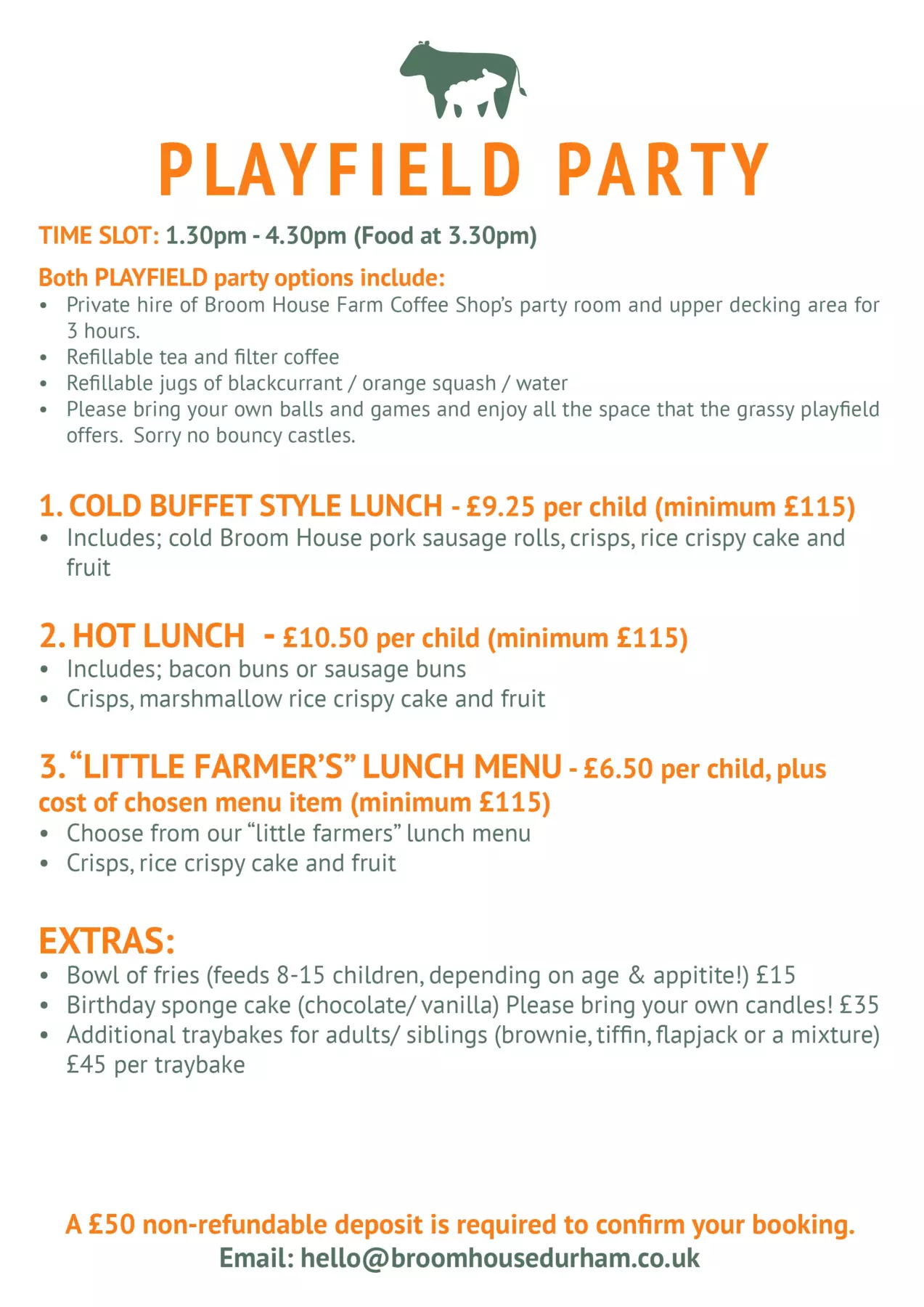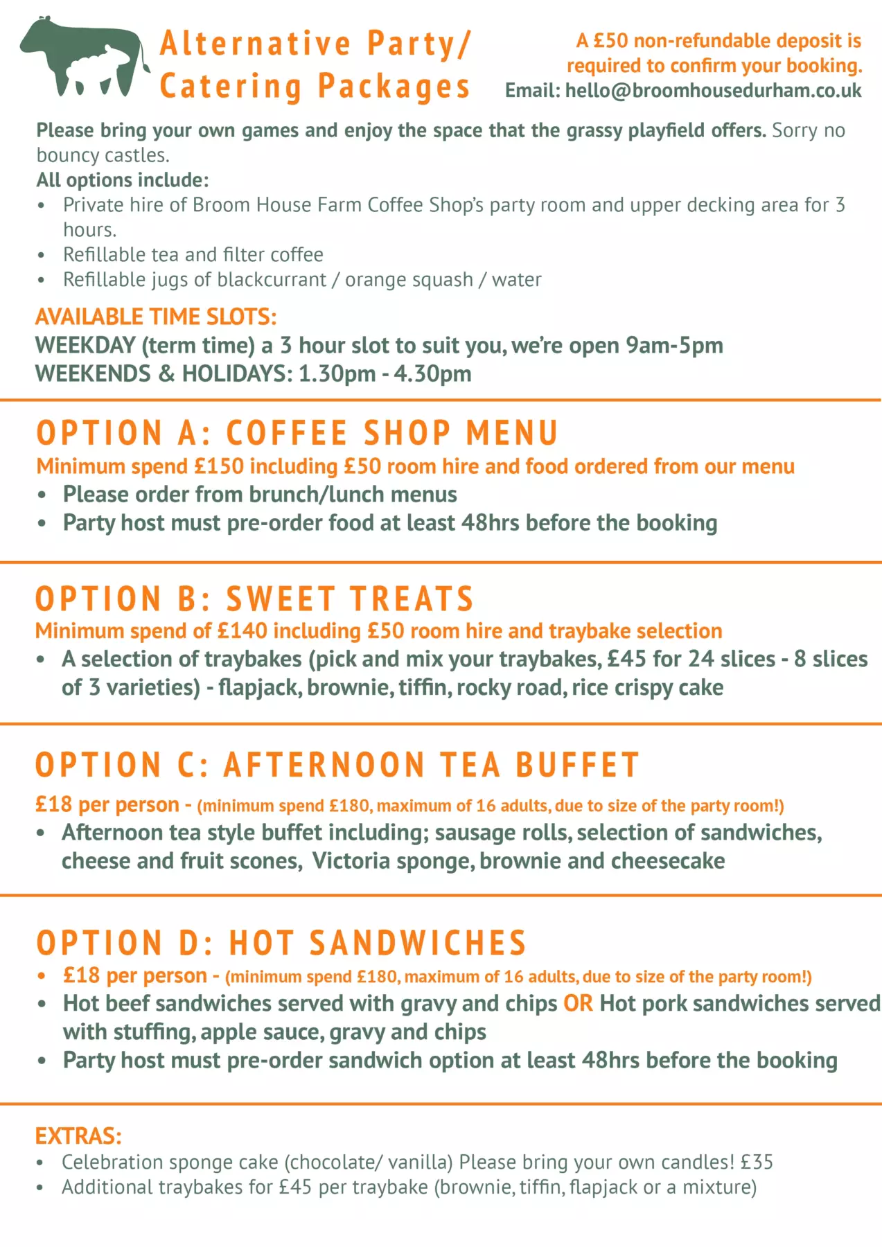 - Private hire of Broom House Farm Coffee Shop’s party room and upper decking area for 3 hours